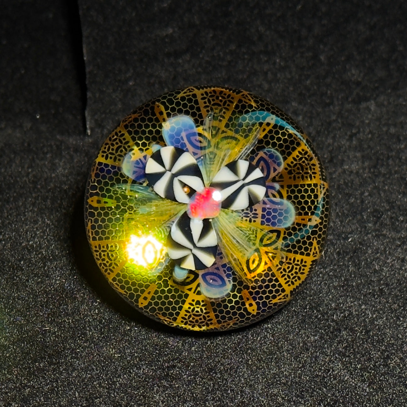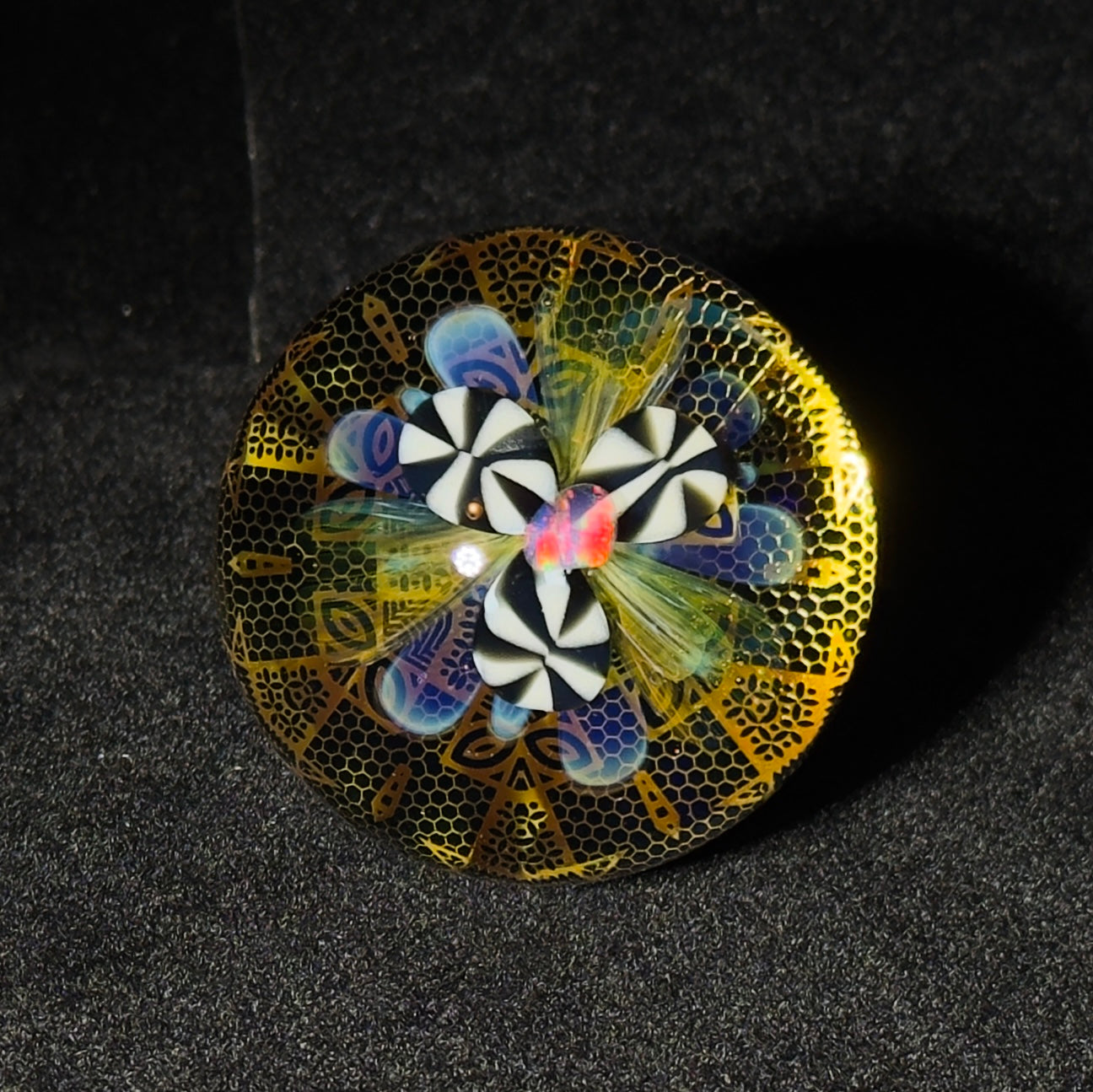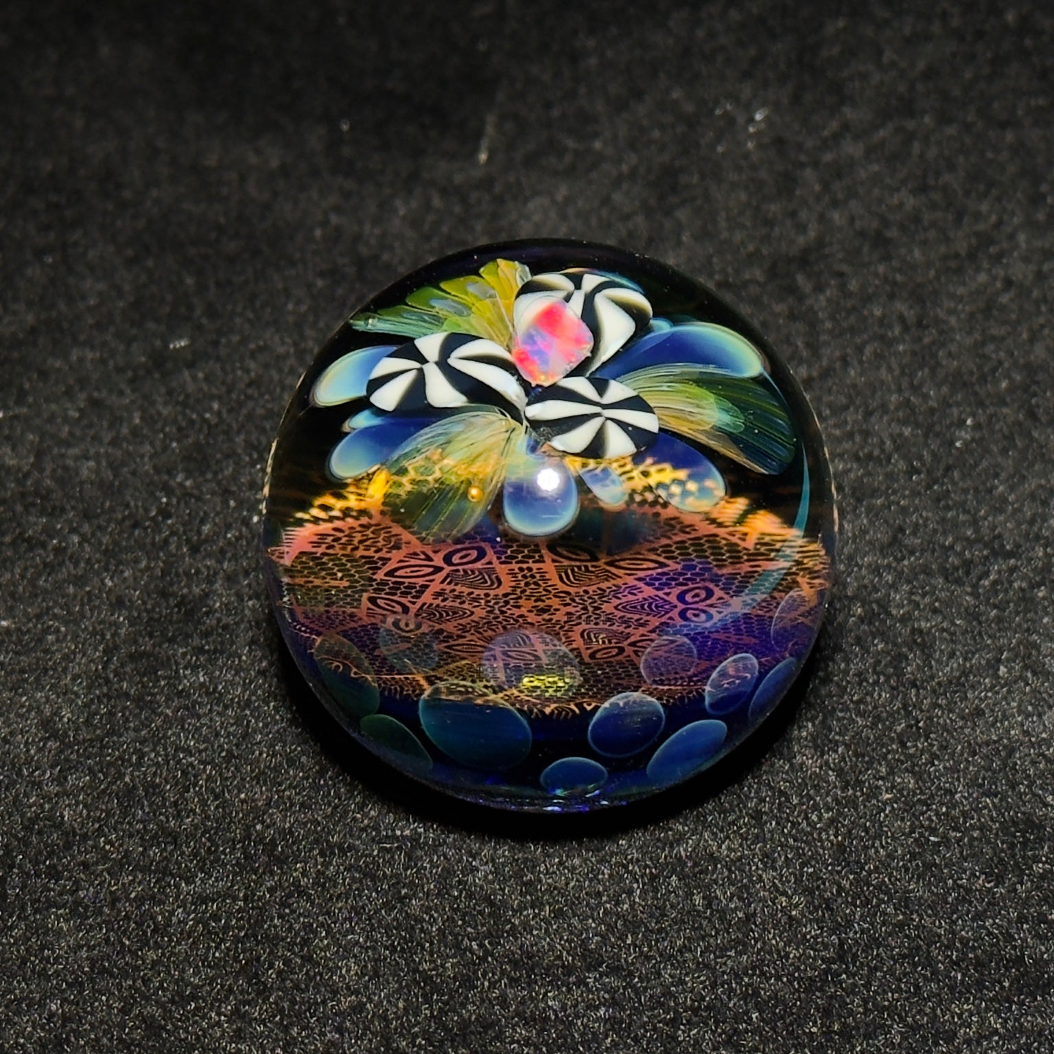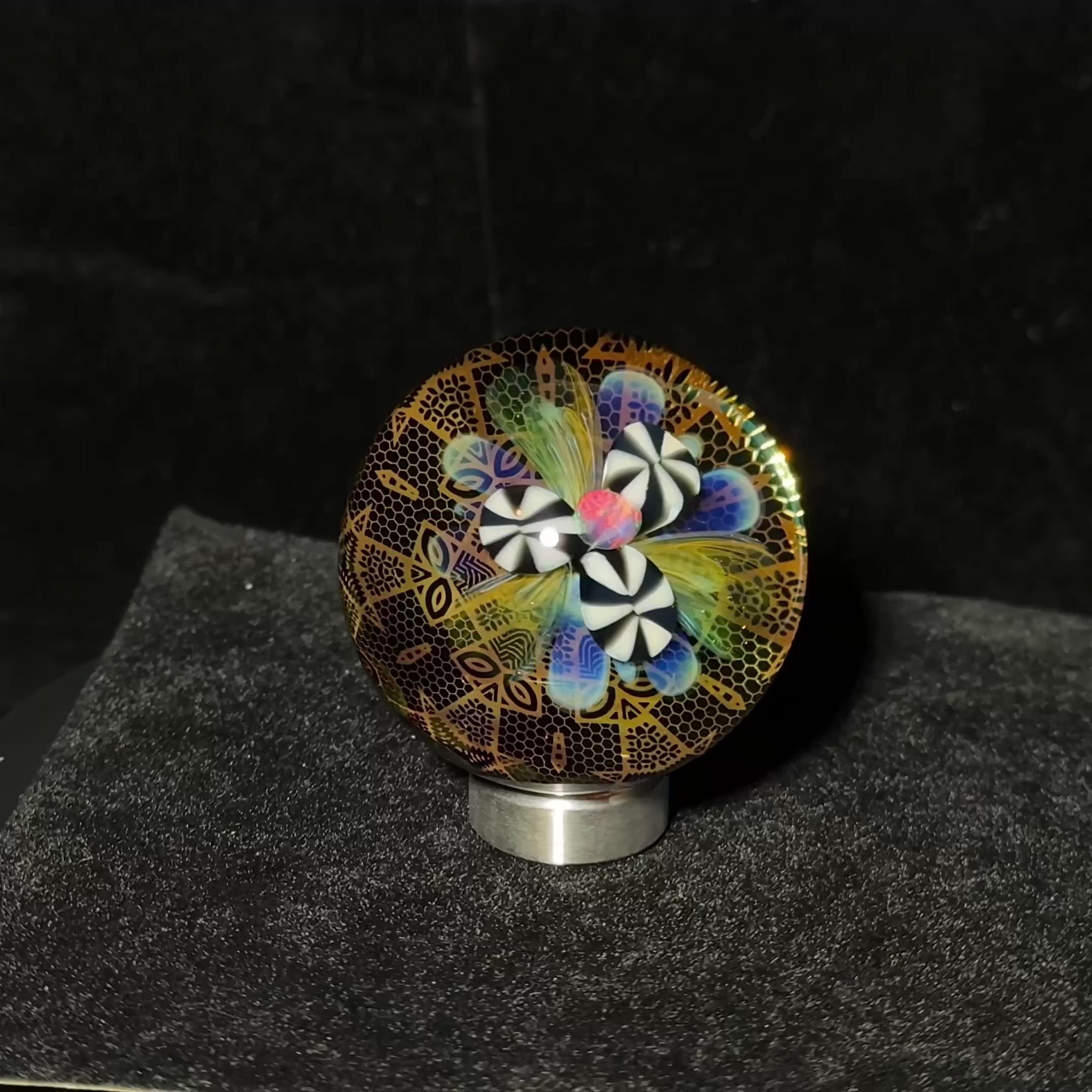 This blown glass marble features a black and white flower design with fume accents and a fiery rainbow tumbled opal floating above it. Beneath the flower is a layer of solid 24k gold fume pattern work. This intricate pattern emits beautiful golden reflections when the light moves across its surface. The back of the marble features gold and silver fume rainbow dots surrounding a fume linework switchback section. There is a lot to take in with this marble and I am excited for it to go to a great home where it can be enjoyed!