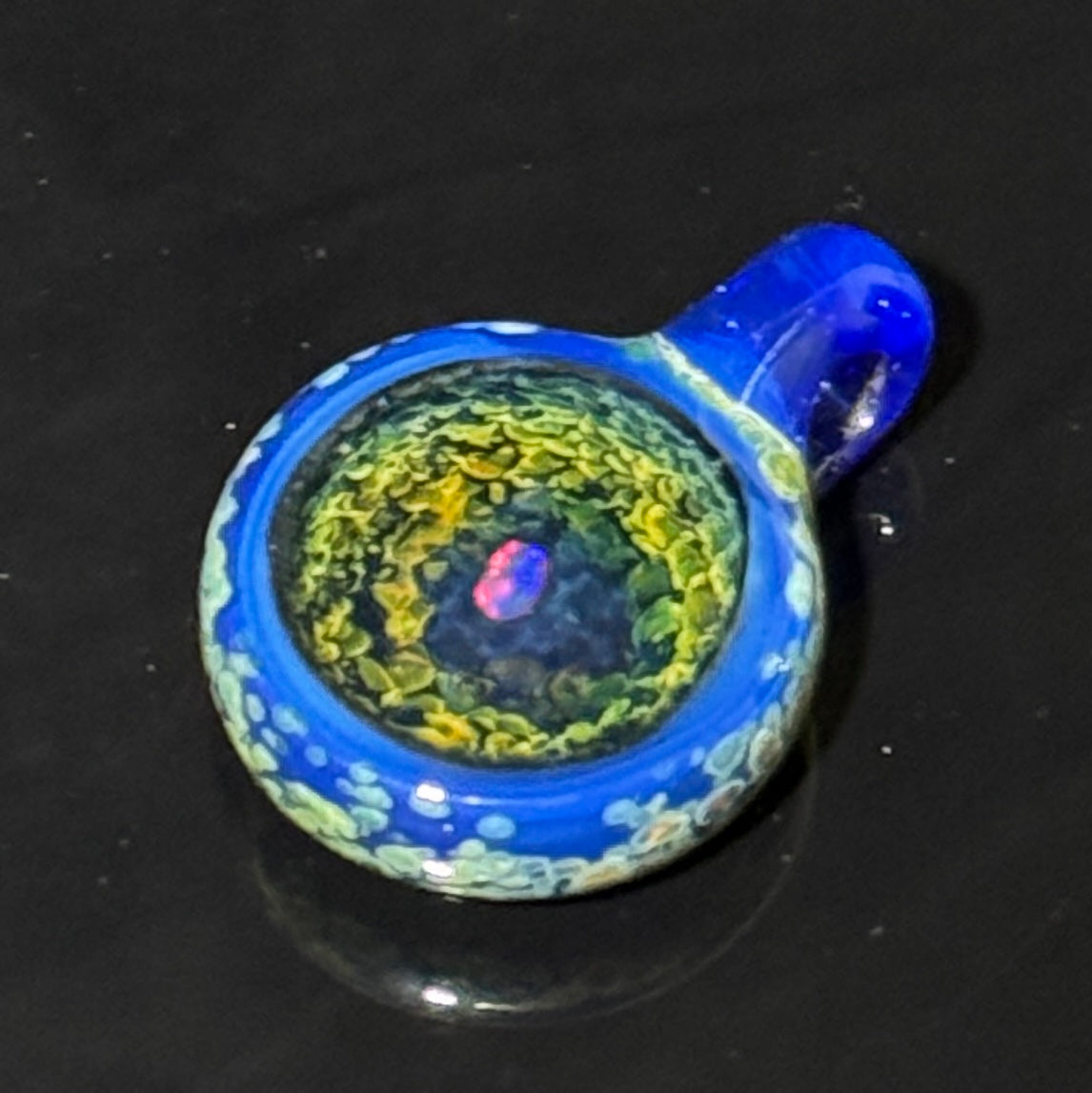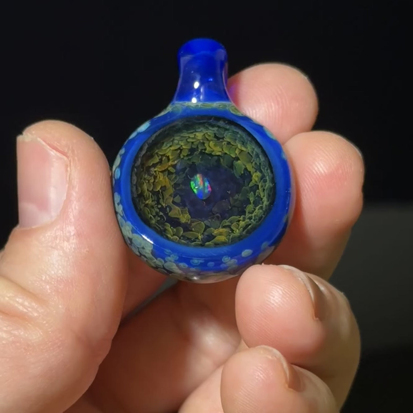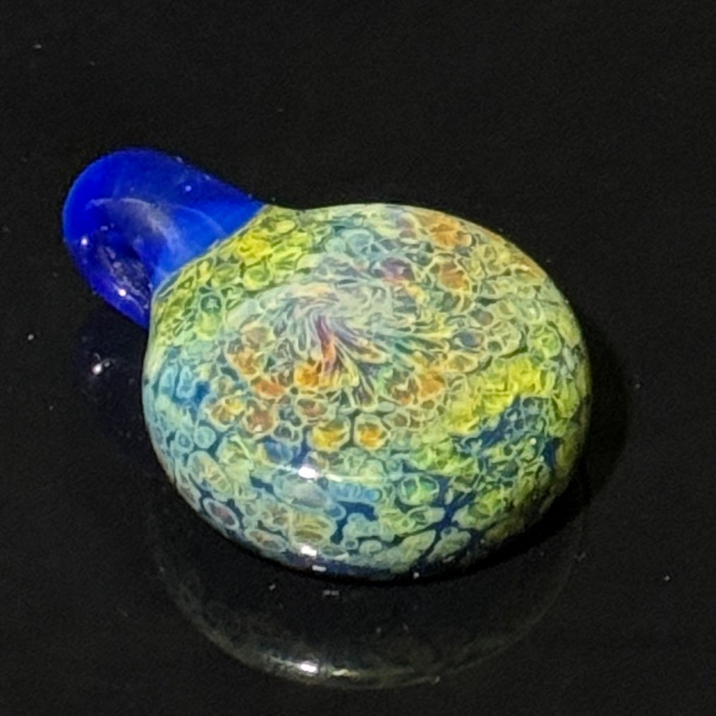 This coldworked pendant features a tumbled rainbow opal floating over a backing over gold and silver fumed frit. The front of the pendant is coldworked to reveal the insides giving it a geode like effect. This pendant features a sonic blue bale.
